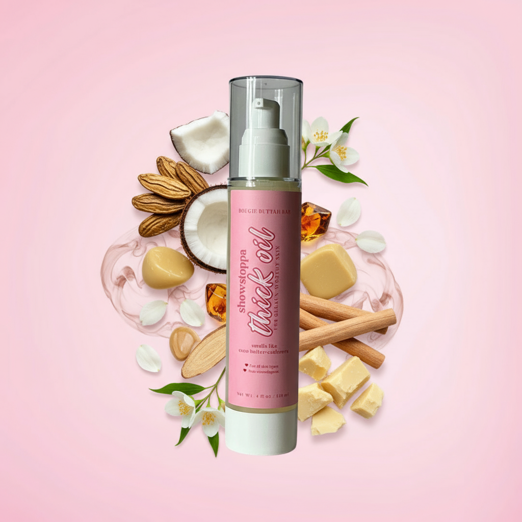 Turn every entrance into a moment with Showstoppa Thick Oil—the ultimate body oil for glowing, soft, unforgettable skin. Wrapped in the warm, comforting scent of cocoa butter and cashmere, this rich oil feels like a hug in liquid luxury. Smooth, velvety, and decadent, it’s made for the ones who like to stand out without even trying.